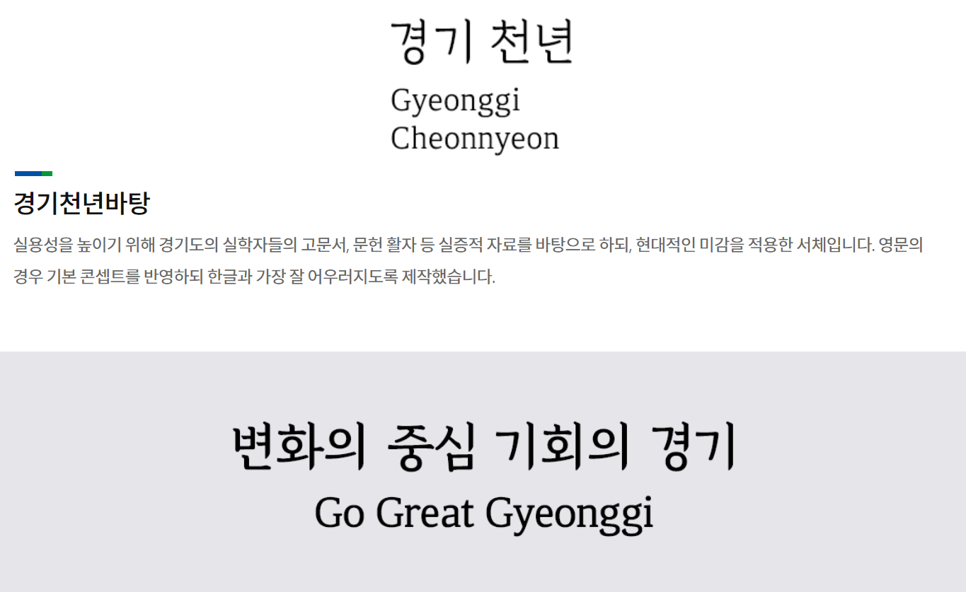 문서의 본문에 조금 멋이 들어간 포인트 폰트로 사용하기 좋습니다. 경기도에서 배포하는 폰트로 누구나 무료로 다운로드하여 자유롭게 사용할 수 있습니다. 영상, 인쇄, 웹 등 다양한 매체에 자유롭게 사용이 가능합니다.