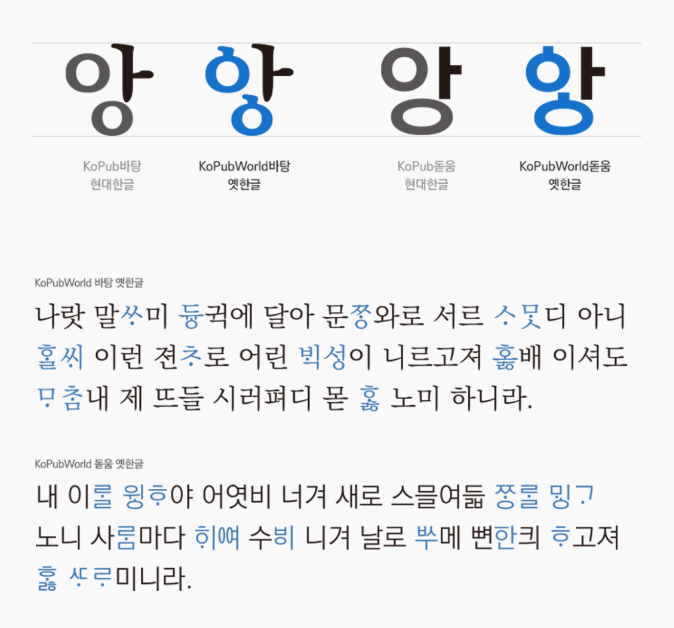 KoPub 서체에서 구현되지 않았던 옛 한글과 한자, 일본어, 라틴어, 러시아, 히브리어, 아라비아어, 산스크리트어 등 다양한 언어를 포함하여 업그레이드되었습니다. KopubWorld 고딕체와 함께 인기가 많은 폰트입니다.