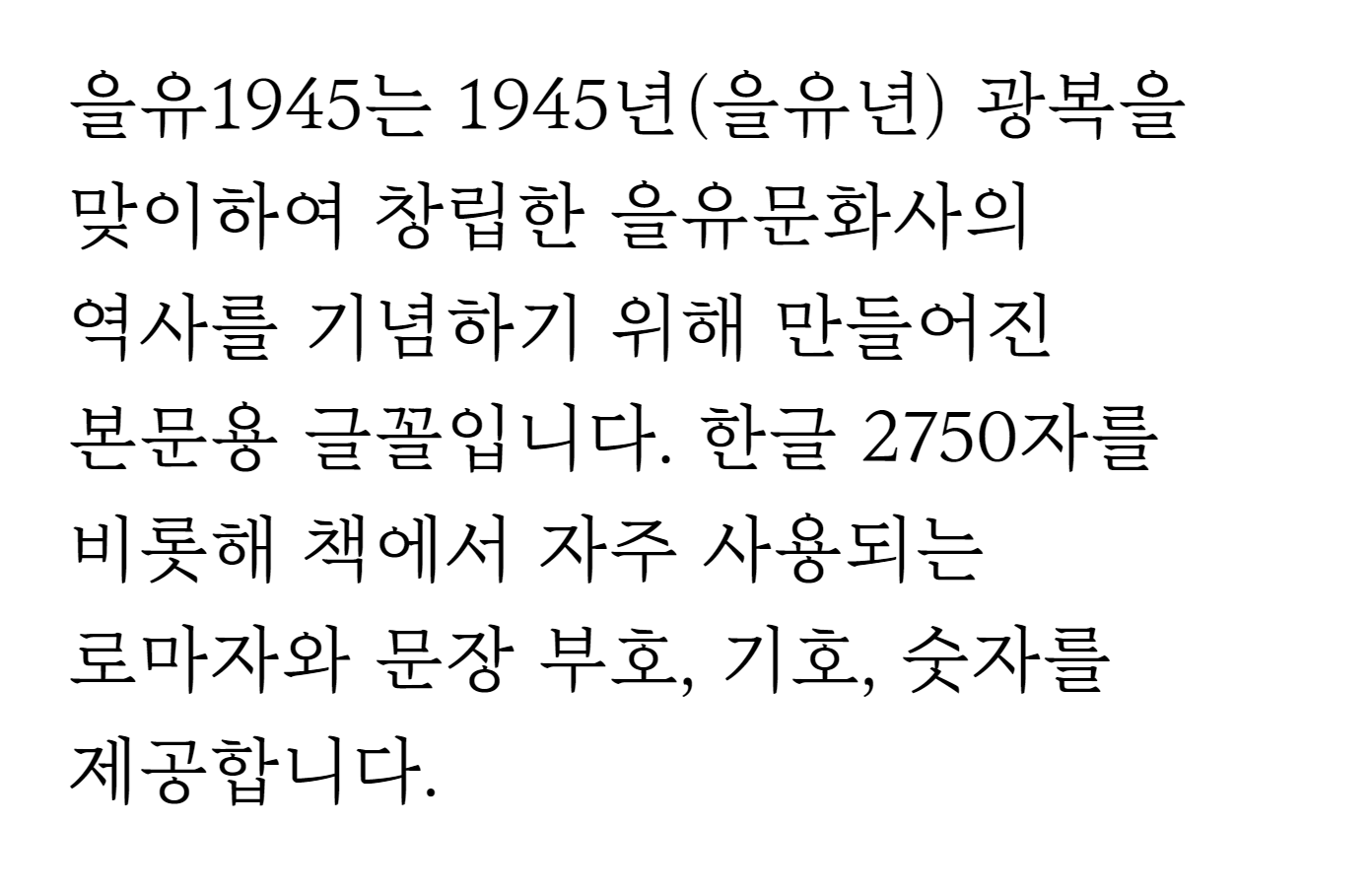 구글과 어도비가 제작하고 배포하는 오픈 라이선스 폰트입니다. 인쇄물, 웹, 영상 등에 무료로 사용이 가능합니다. 단 임베딩은 불가하며 책의 본문에 사용할 경우 표기 가능한 곳에 "이 책의 본문은 '을유1945' 서체를 사용했습니다."라는 문구를 넣어야 합니다.